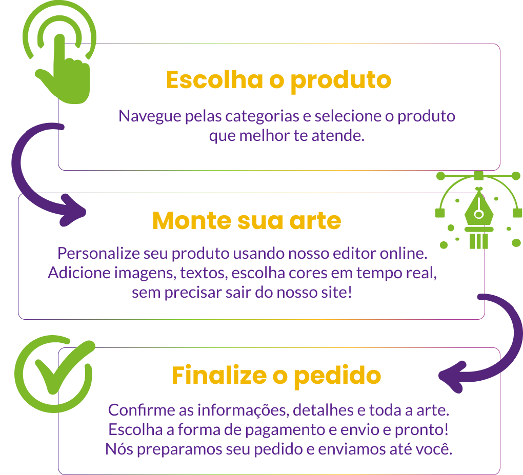 Basta escolher o produto, personalizá-lo usando nossa ferramenta online e adicionar ao carrinho. Depois, é só finalizar a compra informando os dados de entrega e pagamento.